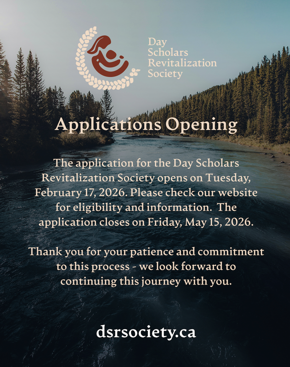 The application for the Day Scholars Revitalization Society opens on Tuesday, February 17, 2026. Please check our website for eligibility and information. The application closes on Friday, May 15, 2026.